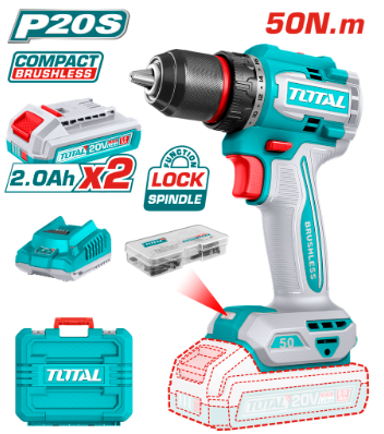 TALADRO ATORNILLADOR INALAMBRICO 1/2″ 50NM 20V INCLUYE 2 BATERIAS 2.0AH, 1 CARGADOR Y ACCESORIOS INDUSTRIAL TOTAL UTDLI205062