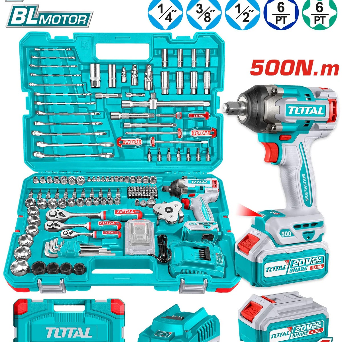 PISTOLA DE IMPACTO INALAMBRICA 1/2 20V 500NM INCLUYE 1 BATERIA 1 CARGADOR + 152 ACCESORIOS INSDUSTRIAL TOTAL UTHKTHP31522